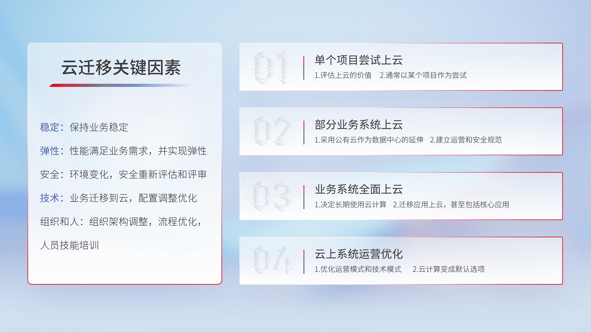 结合实际业务,,,,从规划设计、、、云平台选型、、、、云原生改造、、、、数据迁移、、、集成交付,,迁移全过程为客户识别最佳上云路径,,,,做好风险识别管理,,设计网络架构、、身份权限、、、、安全审计合规、、操作审计、、、、日志审计、、监控告警策略、、、多站点容灾设计等,,,对云上基础设施进行整体规划,,提升IT治理水平,,,以满足弹性、、高可用、、、高性能的需求。。。。
