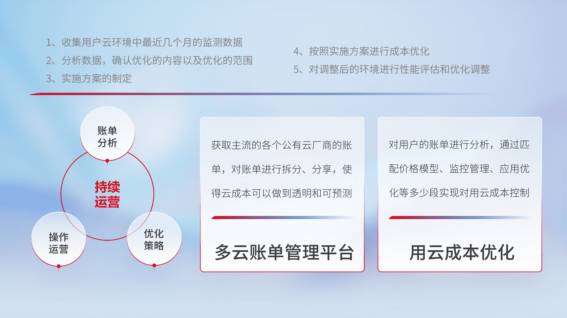通过多云纳管,,以统一的资源数据模型把客户的云资源进行抽象和封装,,,,进而实现对多云资源的统一操作,,,保障云资源管理的可靠性、、、稳定性与可用性。。。量身定制化运维内容,,,配置、、、、开发运维、、、、补丁管理、、备份、、监控、、、、认证和访问管理、、、、审计和日常巡检等,,保障在用云过程中的可靠度,,,,稳定度以及高可用率。。。。