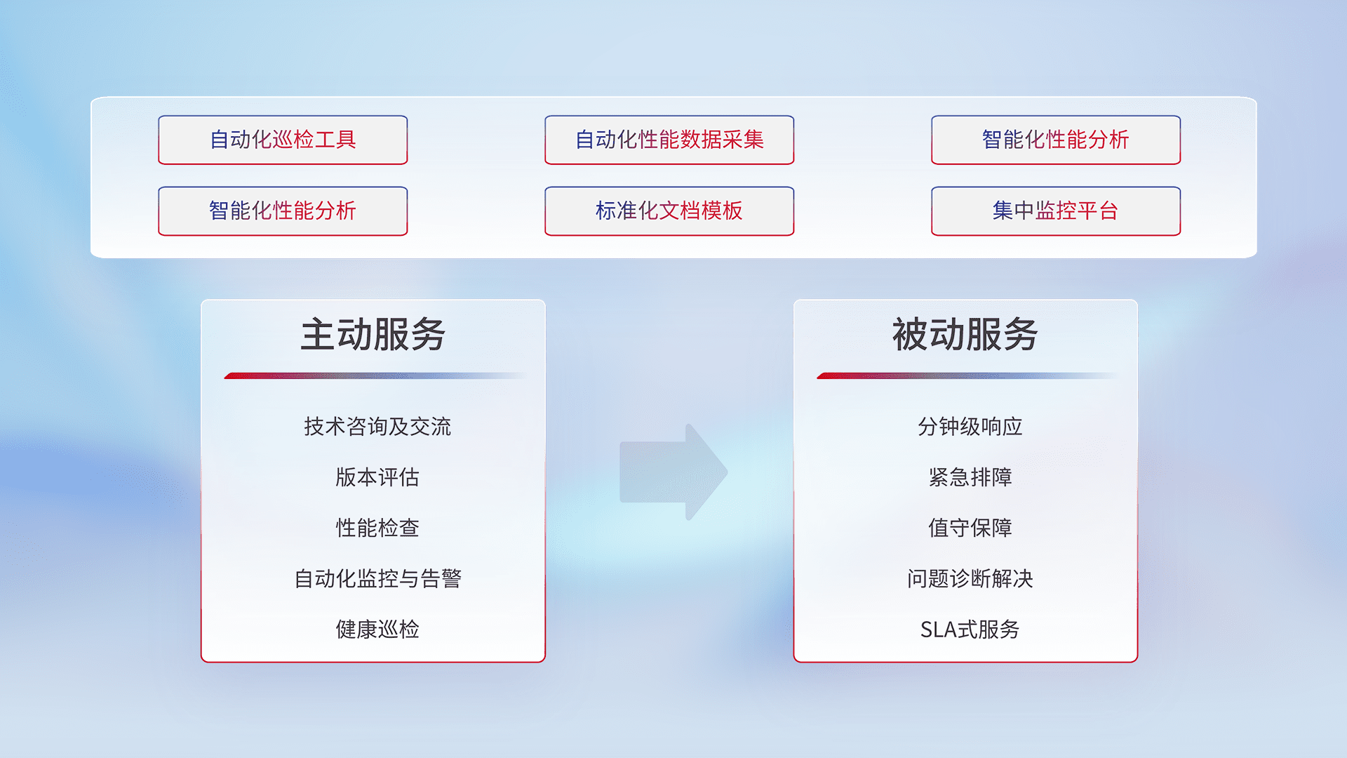 智能化工具和标准化文档,,保障服务质量,,提供主动服务(包含技术咨询、、版本评估、、、性能检查、、自动化监控与告警、、、健康巡检)和被动服务包含(分钟级响应、、紧急排障、、值守保障、、、问题诊断解决、、、SLA服务)。。